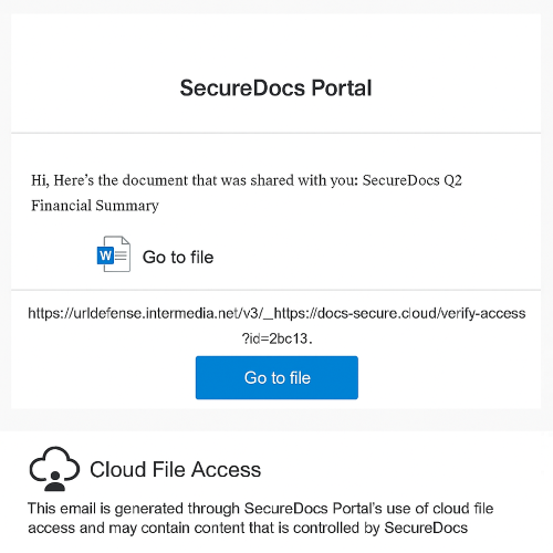 ALT: Email lure spoofing a file share from “SecureDocs Portal” example with a link rewritten by Intermedia’s URL Defense to conceal the true phishing destination.